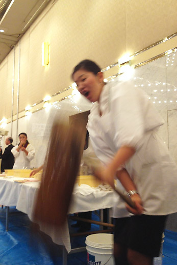 恒例の餅つき。力強く杵を振り下ろすのは同期入会の彩子嬢。