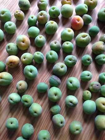 梅の実の一部がほんのり黄色く色付き始めてきたので、急いで梅酒用の青梅を収穫。2.2kgほどを奥さんの実家へ。残りのうち2.2kgほどを仕込む。
